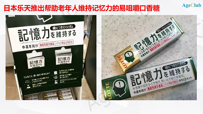 日本乐天就专门为老年人推出了不粘牙口香糖,添加了银杏叶提取物,有助于提高记忆力。该款口香糖易于咀嚼且不粘牙,装有假牙或换牙的人群都可以食用,在老年群体中受到欢迎。