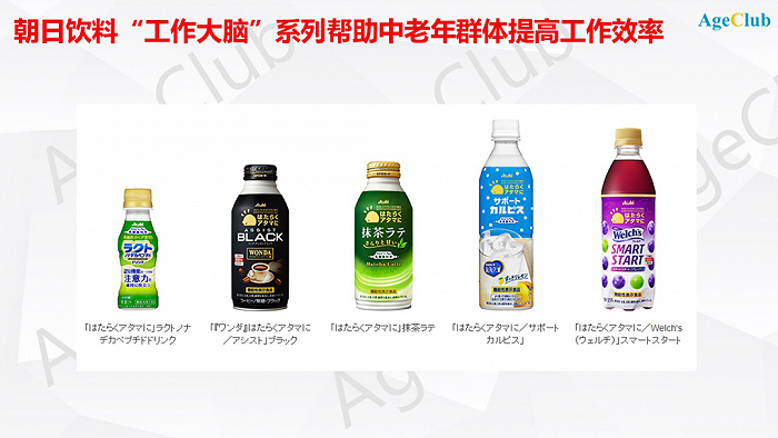 日本三大饮料公司之一朝日饮料在2019年推出了针对用脑健康的功能性饮料“工作大脑”系列,包含乳酸菌饮料、咖啡和果汁。该系列添加了有利于保持注意力的成分乳酸脱脂肽Lactonona decapeptide,适合容易忘事的老年群体提高工作效率。