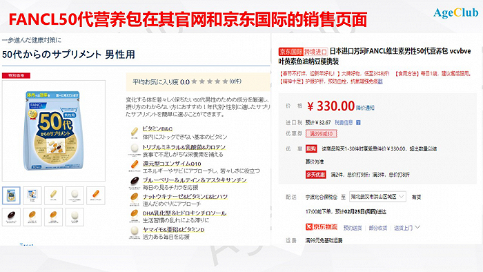 不管是日本还是中国,保健品都是老年群体感知最强的健康增益产品,FANCL 50+男性综合营养包在两国的热销就是最好的证明。