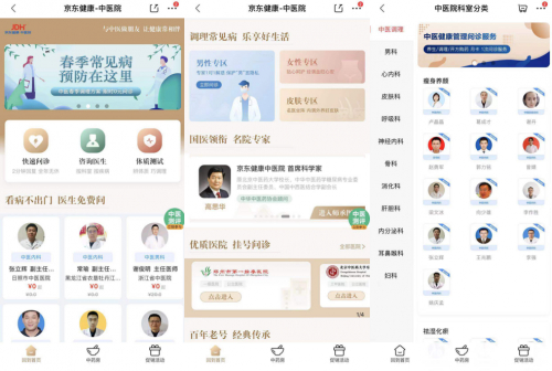 2020年6月7日,京东健康中医院及中医会诊中心上线。京东健康中医院邀请国医大师、名老中医及其专家团队入驻,目前已有包括张大宁等7位国医大师、高思华等9位国家名老中医领衔的9000多位中医科医生入驻,组成了强大的中医阵容,为患者和用户提供在线问诊、复诊续方、团队会诊等服务。