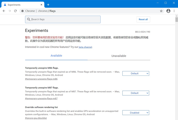 谷歌Chrome浏览器将提供 “实验性功能”按钮