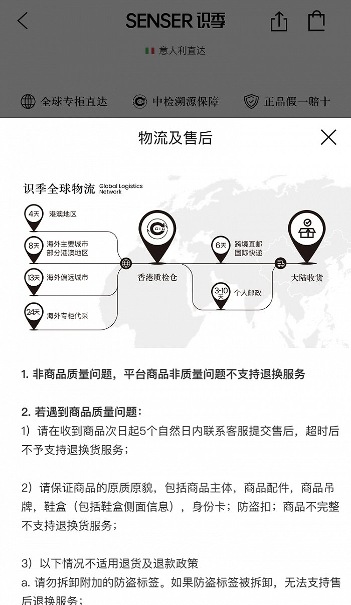 识季APP上提供了一张平台全球物流图谱。界面时尚看到,平台采购专员在全球各地完成奢侈品采购后,将奢侈品统一寄送到香港的质检仓中转。商品再从香港质检仓库寄出,以跨境直邮国际快递或个人邮政的方式,接送到买家手中。