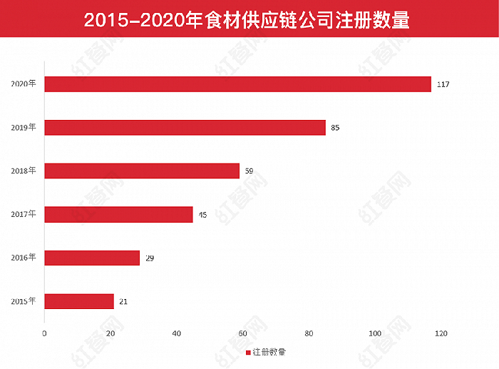 而企查查数据也显示,自2015年起,食材供应链公司的注册数量也在逐年递增。2015年食材供应链注册数量仅21家,到了2020年,新注册的食材供应链公司则翻了5倍之多。