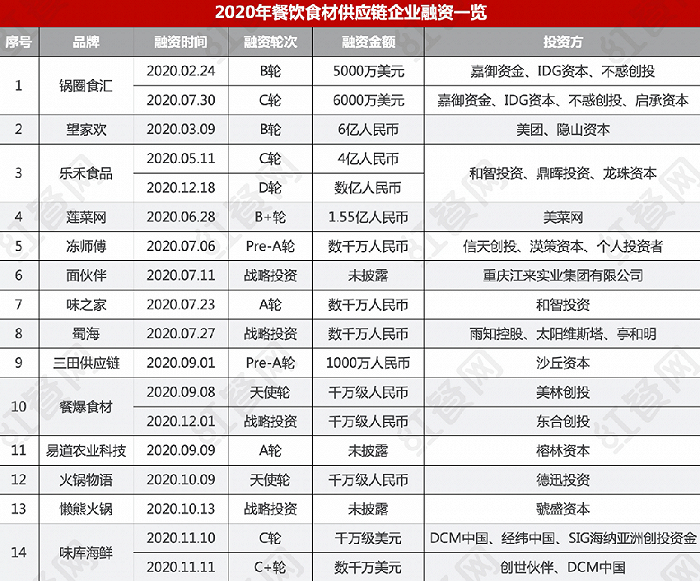 据红餐网不完全统计,2020年全年,至少有14家食材供应链企业获得了融资。入局食材供应链行业的投资机构不乏DCM中国、IDG资本、经纬中国等知名VC机构。