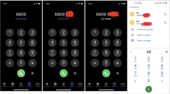 请看下面的截图举例:在 iPhone 上,直到我把我女友的电话号码八位数全部输入完,它才会显示我女友的联系人信息;在 Android 上,拨号器已经通过第二个号码数字确定了联系人。
