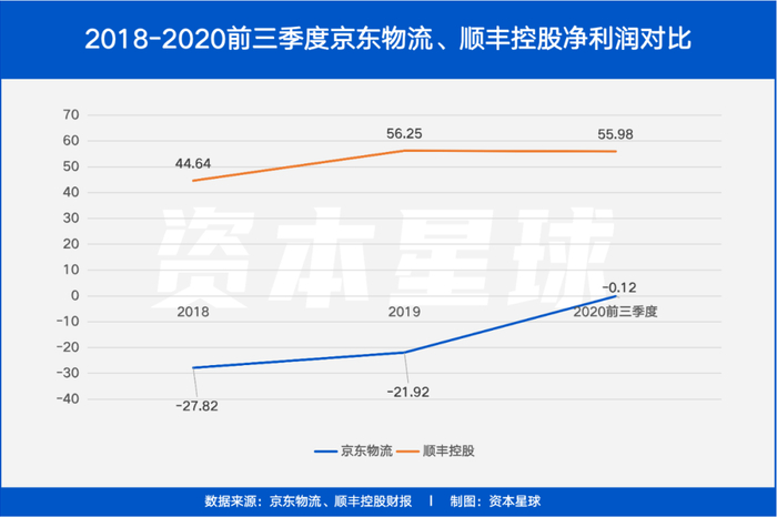 从净利润数据来看,差距则更加明显。顺丰控股已经将年利润稳定在了50亿以上,而京东物流在2018、2019年连续巨亏20亿以上后,终于在2020年前三季度勉强接近打正。