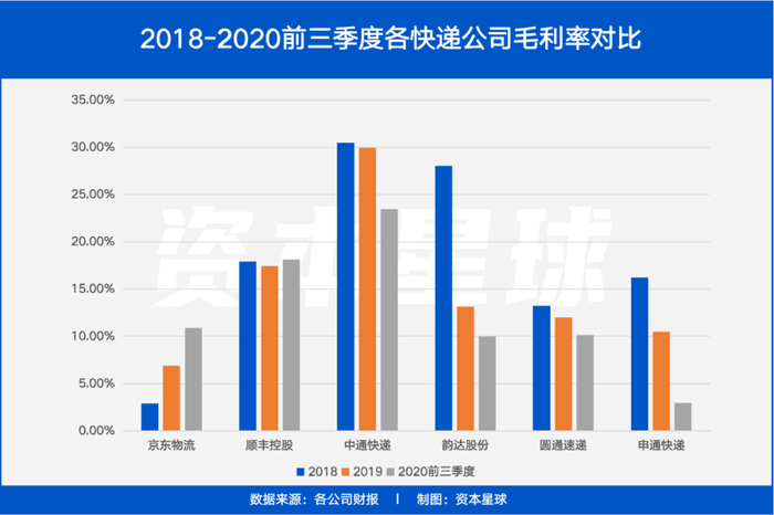 中通2020年前三季度的收入仅169.57亿,不到同期京东物流收入的一半,但单从经营来说那是省钱第一名,以稳定在20%以上的毛利率力压群雄。
