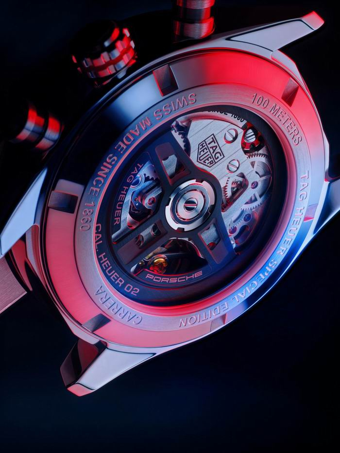 PORSCHE刻字在表圈上清晰可见。腕表采用保时捷标志性的红色、黑色和灰色配色贯穿整体,这些色彩也让人联想起豪雅的一些历史经典表款。经重新设计的摆陀对保时捷知名的方向盘设计致敬,透过透明蓝宝石表底盖一览无余,并印有“Porsche”和“TAG Heuer”字样。专为这款腕表打造的表盘沥青效果,诠释出对赛道的热情,而阿拉伯数字则代表了保时捷精致时尚的跑车仪表盘上的数字。