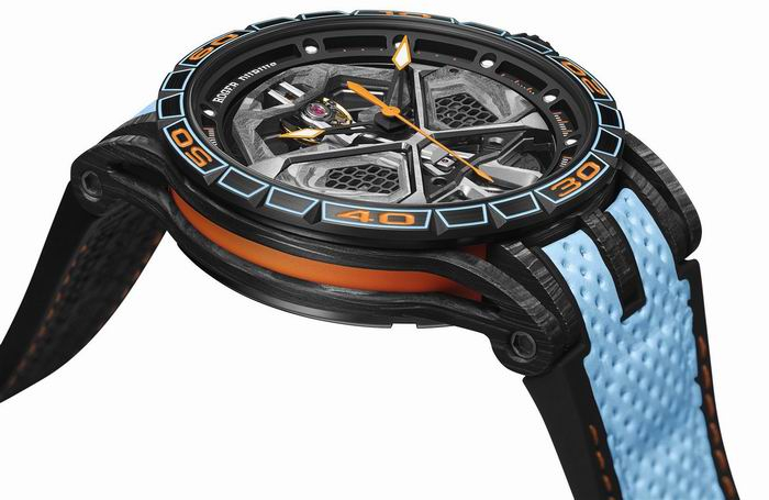 45 毫米的 Excalibur Huracán STO 腕表与其同名汽车一样散发着昂扬振奋的气息,搭载着具有蜂窝状格栅的RD630 自动上链机芯。此表款配备 12 度倾斜摆轮和 360 度旋转摆陀,此摆陀与 Huracán 跑车车轮一样呈现出迷人的速度效果。Excalibur Hurácan STO 腕表搭配亮丽的碳纤维表壳和黑色 DLC 钛合金表圈,其上层机芯配备形似“引擎室拉杆”的桥板,让人联想起 Lamborghini Huracán兰博基尼超级跑车本身的 V10 引擎。此表款的创新表带具有动感醒目的精修效果,穿孔的蓝色小牛皮使下层橙色织物得以散发出热情奔放的气息,背面则衬接舒适的橡胶材质。