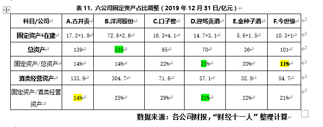 表11显示,在换算前,今世缘的固定资产比例最低,仅占总资产的11%;古井贡酒和洋河股份等值,均为14%,而其他三者,均在20%以上。