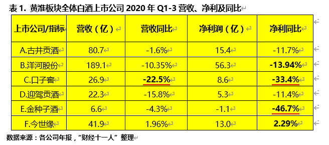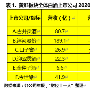 表1是“黄淮板块”全体上市公司的2020年前三季度业绩。苏酒“今世缘”(603369.SH),在疫情下,实现了营收、净利双增;而洋河股份和徽酒四公司,则营收、净利“双杀”。