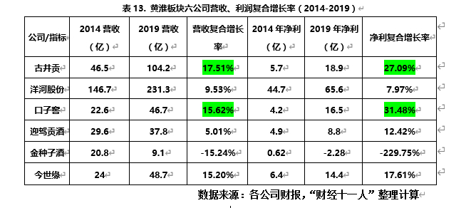 从表13的营收、利润的复合增长率可知,过去五年,古井贡酒、口子窖的表现非常突出;