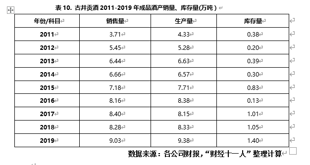 从2011年开始,古井贡酒才开始公布每年成品酒的生产量、销售量和库存量,见表10。