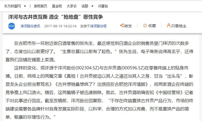在徽酒倚重的本埠和“环徽”,洋河股份对其形成了比川酒更可怕的钳制。数年前,洋河股份、古井贡酒渠道互掐的新闻不绝于耳(见下图)。