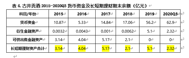 但资产负债表是静态指标,2019年年末这个节点,未必科学。《财经》统计了古井贡酒2015-2020Q3的货币资金和理财的期末余额,见表4。