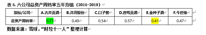 生产企业不会理财或拥有大量金融理财资产,必然意味着总资产周转率偏低。但从表5可以看出,古井贡酒却拥有最高的总资产周转率。这也可以解释为,其将多数资产投入了白酒主业。
