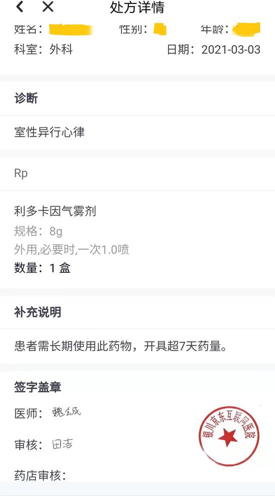 另一种局部麻醉药利多卡因气雾剂,也可以在京东健康上轻松开出超过7天用量的处方,全程没有任何医师或药师提出问询。处方补充说明一栏只写着“患者长期使用此药物”。