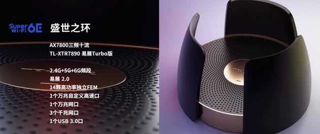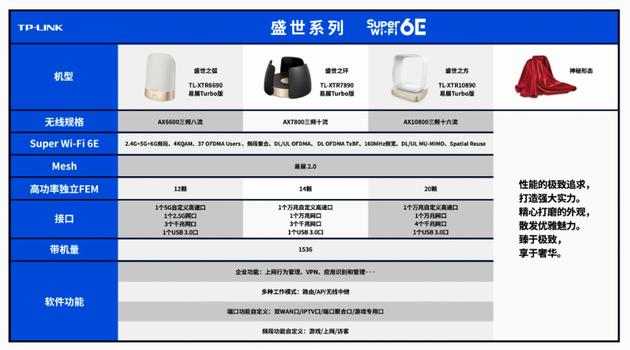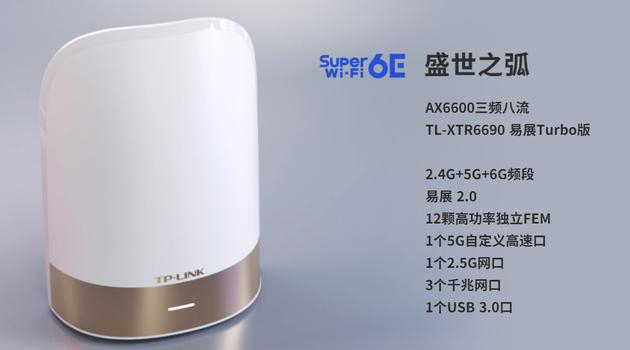 “盛世”系列第一款产品型号为 TL-XTR6690,支持三频八流无线天线规格,具备 12 个独立 FEM 无线信号放大芯片。这款路由器提供一个 5G 自定义网口、一个 2.5G 网口以及 3 个千兆网口,三频网络总速率可达 6600Mbps,带机量 1536 台。