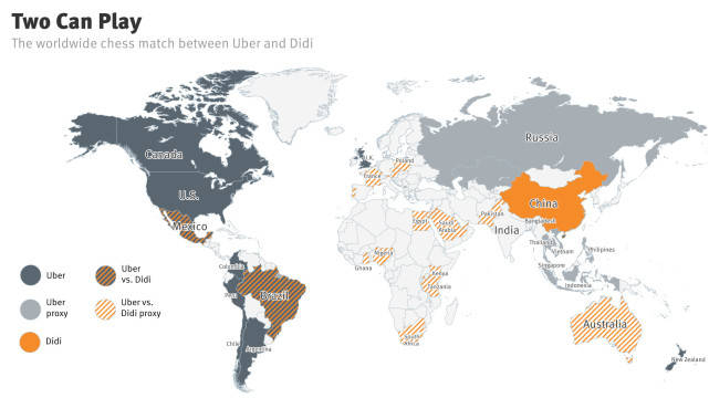 当时Uber与滴滴在全球交火,The Information汇总了一张世界地图,展示两大巨头业务覆盖区域。从巴西到中东,从墨西哥到澳大利亚,的确如程维所说,经历了一场“凡尔登战役”。