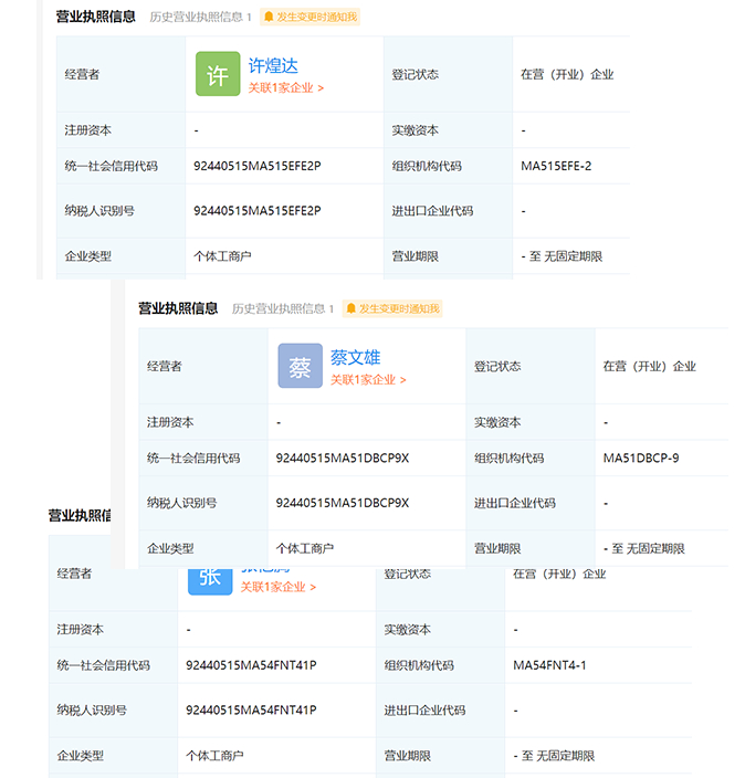 我们根据这些名称,通过企查查随机查询了其中几家公司。然后我们发现,只有几家公司的注册资本在十万上下,更多的公司注册类型则属于个体工商户,没有注册资本的相关信息。