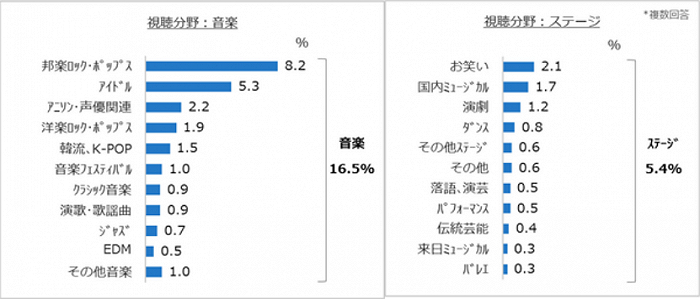 从观看内容来看,音乐类别(16.5%)远超戏剧、小品等其他舞台演出(5.4%)。在音乐方面,日本摇滚流行歌曲(8.2%)和偶像(5.3%)占比较大;在舞台演出方面,搞笑小品(2.1%)和国内音乐剧(1.7%)、戏剧(1.2%)占比较大。总体看来都属于原本在线下就比较热门的类别。