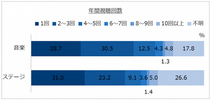 ●一个人一年平均观看频率,音乐领域2.7次,舞台领域2.5次。