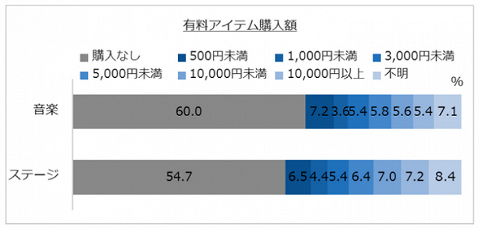 从在线其他消费支出来看,在观看过收费线上演出的人中,除购买电子票外,还有“打赏”等其他消费支出的人,在音乐领域占40.0%、在舞台演出领域占45.3%。在舞台领域,“打赏”等其他消费支出的年均7642日元,超过了音乐类别的5739日元。消费金额也存在差别,消费“不满500日元”的人,在音乐领域占7.2%,在舞台领域占6.5%。另一方面,消费“1万日元以上”的人,在音乐领域占5.4%,在舞台领域占7.2%。有少数人消费超“10万日元以上”,有粉丝将大幅超过电子门票的钱花在了其他收费项目上。