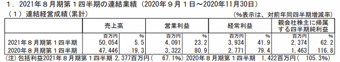 USEN-NEXT集团最新发布的2021年8月期第一季度(2020.9.1-2020.11.30)财报数据,销售额500亿5400万日元,同比增长5.5%,营业利润40亿9100万日元,同比增长23.2%,经常利润39亿3400万日元,同比增长41.9%,归于母公司股东本期纯利润23亿7400万日元,同比增长62.2%,实现大幅增收增益。