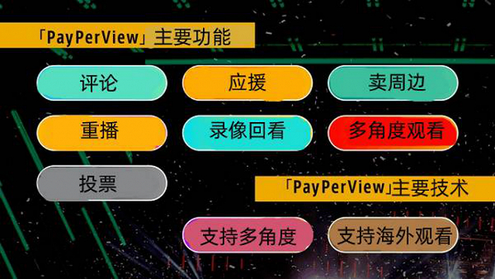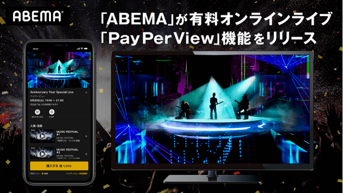 2020年,Abema也在积极开展收费线上演唱会业务,于6月推出了“PayPerView”功能。此功能可以按照Abema上发布的演唱会、演出活动、体育赛事、时尚走秀、舞台剧等类别,一次性购买一个类别的收费直播内容。运营集团与3DCG动画广告制作公司的CyberHuman Productions合作,利用能够实时将人物与3DCG空间合成进行拍摄的“虚拟摄影系统”,打造不同于CG、3D、AR的临场感,提高观众视听体验。据称该系统目前在日本仅有3台。另外,还具有演唱会中给表演者发送表情的应援功能、多角度观看演唱会、投票、购买周边等多种功能,实现与表演者的双向交流。