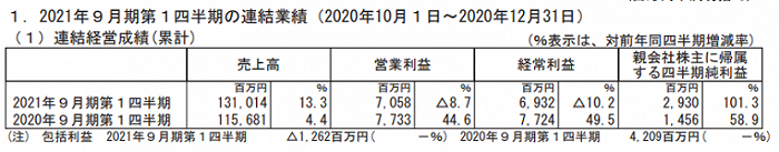 CyberAgent最新发布的2021年9月期第一季度(2020.10.1-2020.12.31)财报数据,销售额1310亿1400万日元,同比增长13.3%,营业利润70亿5800万日元,同比下降8.7%,经常利润69亿3200万日元,同比下降10.2%,归于母公司股东本期纯利润29亿3000万日元,同比增长101.3%。销售额增长,利润下降。