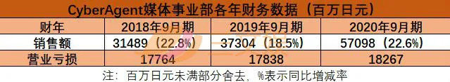 虽然AbemaTV开设近5年,但从CyberAgent近3年的财报数据来看,媒体事业部一直处于销售额稳步增长、营业利润持续亏损的状态。从长远来看,CyberAgent将包括AbemaTV在内的媒体事业作为企业中长期事业支柱进行培养,将持续加大投资力度。