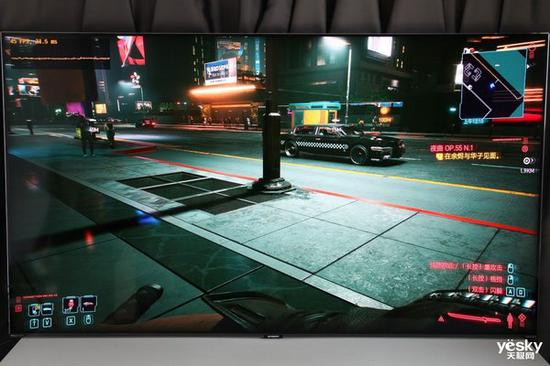 接下来是4K游戏画质体验。最近流行的游戏“赛博朋克2077”,其中有许多明暗对比强烈的场景,黑夜中的灯光等等,很适合用来表现MiniLED电视的特色。