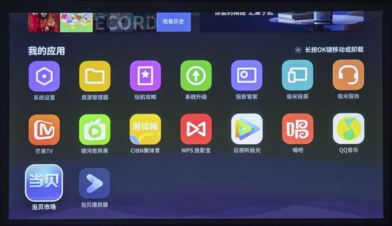 极米H3S支持安装第三方软件,内置了投影管家、极米投屏、极米服务、芒果TV等应用,不过其自带的应用商店能搜索到的应用数量较少,用户可以通过连接U盘自行下载安装。