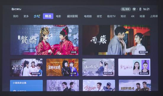 极米H3S搭载了基于安卓9.0 的INUI系统,其UI界面和大部分主流投影界面相似,导航栏位于页面上方,左右滑动进行选择。导航栏有我的、更多、少儿、精选、电影、电视剧等选项,操作逻辑也与主流投影相同,用户很快就能上手。