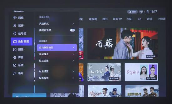 极米H3S支持自动梯形校正,投影仪位置发生偏转后能够自动调正画面,也可以打开“设置”,进入“投影画面”,选择自动或手动校正。同时,极米H3S还支持画面自适应功能,在进行自动梯形校正的过程中,能够避开投影区的障碍物,这个功能还是较为实用的。