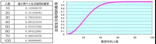 如果人数继续增加,这个概率还会急剧上升,50个人班级的这一概率是97.0%,60个人则达到99.4%,70个人已经是99.9%。换句话说,70个人的班级内没有任何生日相同情况出现的概率小于千分之一。