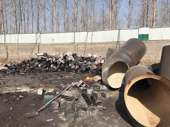 谈及污染与安全隐患,雷桐也向第一财经1℃记者出示了亲自拍摄的几组视频,在一段视频上,非法冶炼厂的工人们正在用斧头劈开一块废旧铅酸电池,而硫酸随着裂痕逐渐往外渗;在另一段视频上,则是一辆被烧焦的大货车,以及被烧得一片狼藉的厂房。“这些还都是我亲眼见到的。”雷桐说,那段被烧焦、烧毁的厂房、汽车视频,是2017年时,中部某县影响颇大的一起废旧电池自燃的事故现场,他得知消息前去时,看着那些被烧伤的工人,内心实在不知是该怜悯他们,还是该暗称“老天报应”。