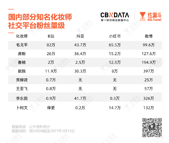 以微博粉丝最多的航悦来说,曾经给李冰冰、张雨绮、肖战等明星化过妆的他,2019年底首次出现在深夜徐老师的视频中,微博单条视频播放量达到834万,转发近万。瞬间火爆的化妆视频给航悦带来了大量关注度,不少网友呼吁航悦开设个人美妆频道。
