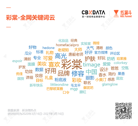 2020年,彩棠与多个国货品牌共同出圈。新浪微热点数据显示,以“彩棠”为关键词,修容和高光作为其明星产品背多次提及。毛戈平、珀莱雅、colorkey、御泥坊、hedone等品牌也常与彩棠一同出现。