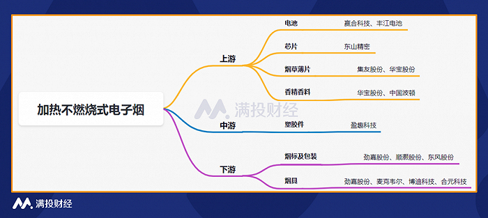 从电子烟的角度来看,分别为两种不同的产品品类。一种是加热不燃烧型,一种是蒸汽式电子烟。那么从上中下游的相关公司中,也是两种路径。