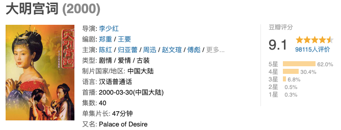 虽然一如既往的,很多批评集中到了演员身上,但在读娱君看来,刘涛和周渝民等人的表演中规中矩,并不足以成为《大宋宫词》口碑表现的原因。从编剧角度来看,当年《大明宫词》是改编自孙自筠的历史小说《太平公主》,这是孙自筠60岁退休后动笔完成的历史小说,《大明宫词》的编剧郑重还有作品《橘子红了》,另一编剧王要参与编剧《疯狂的赛车》《落叶归根》,都是口碑之作;而《大宋宫词》的编剧张永琛,4.2分的《汉之云》、3分的《孤芳不自赏》,显然就是过去几年“大IP+流量”的参与者,从《大宋宫词》的剧情也能看出一些相似点。
