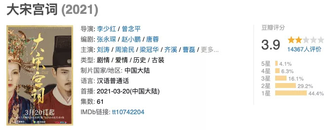 事实是残酷的,在观众心目中两部剧的差距恐怕就是那么大。《大明宫词》现在仍在9分以上,《大宋宫词》刚播出时还有6分,最低降到了3.9,隐约有成为国民口碑烂剧的可能性。观众对该剧剧情、剪辑、台词的诟病盖过了物料和美学上的少数优点,将这部剧的评分打压到了谷底。