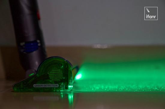 激光装置集成在主吸头软绒吸头的右侧,是一个距离地面 7.3mm 的激光二极管,当清洁的时候,二极管会通过一个透镜向外散射,正好形成一个覆盖主吸头的绿色光带,从而照亮吸头前方的微尘。