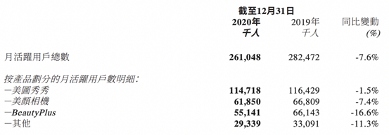 一个简单对比是,美图2016年上市之时的招股书中,美图月活跃用户数4.56亿;2017年1月,美图用户活跃数据创新高,达5.2亿。而截至2020年年底,美图公司月活跃用户总数仅为2.61亿,较最巅峰下降了43.2%,较去年同比下降7.6%,较2020年上半年的2.9541亿环比下降11.6%。