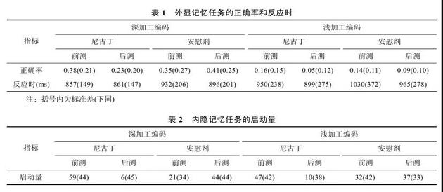尼古丁对外显、内隐记忆的影响(括号内为标准差)。使用尼古丁后,受试者外显记忆编码任务正确率下降,内隐记忆任务的启动量下降,而安慰剂组差异不显著