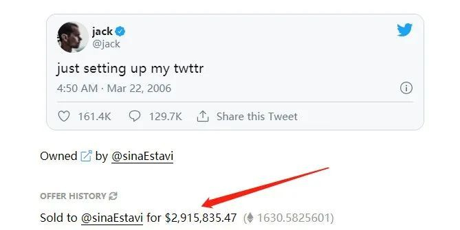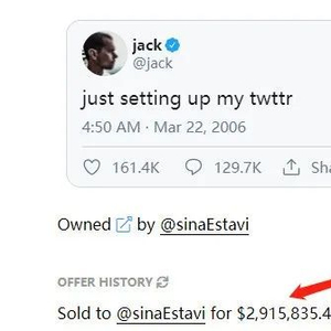 还记得此前 Twitter 创始人 Jack Dorsey 拍卖第一条推文的事儿吗?最终价格出来了,这条人类史上第一条推文,通过 NFT 卖了将近300万美元的天价!