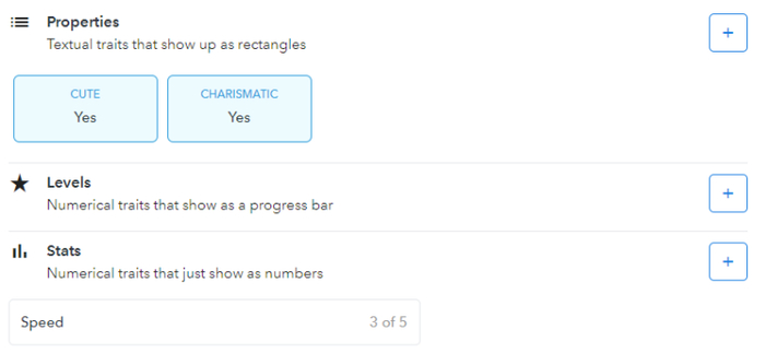 除了这些基本信息之外,我们还可以给这个作品添加一些“属性”,就像《精灵宝可梦》等游戏里那样,比如“移动速度”、“幸运值”、“魅力”之类的。这是因为在此之前 NFT 经常被用来制作和交易收藏卡片,比如数码宠物、虚拟体育明星等等。