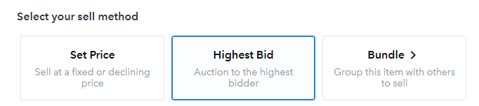 首先我们需要选择一种出售方式,可选的有固定价格、拍卖和打包出售这三种。