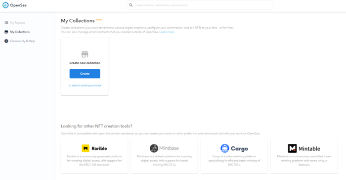 无论是 OpenSea,还是这个页面下方列出的 Rarible、Mintbase、Mintable、Cargo 等,都支持 NFT 相关的以太坊区块链标准,可以把作品 mint 成一个 NFT。用户可以直接在 OpenSea 上创建,也可以导入在其它平台上创建的 NFT。