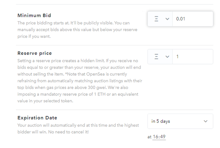 在 OpenSea 上,固定价格还包括一个递减价格的模式:设定好上架期限和最终价格,这样 NFT 上架之后,价格就会慢慢降低,直到期限结束时,价格降低到设定的最终价格——有点类似于清仓甩货的感觉,似乎挺适合硅星人这种首次卖 NFT(极度缺乏自信)的人……
